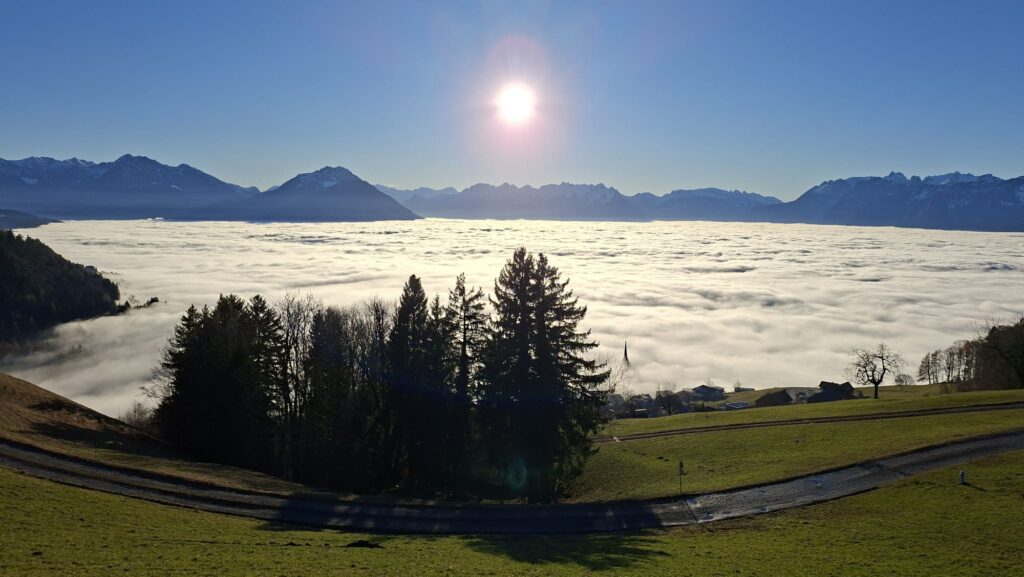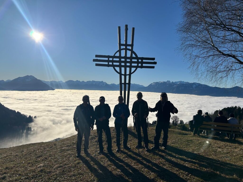 Fünf Personen unternahmen bei strahlendem Sonnenschein eine Wanderung auf die Hohe Kugel. Während im Tal dichter Nebel lag, genossen sie oben die Sonne und eine wunderschöne Aussicht. Der Kontrast zwischen Nebel und klarem Himmel machte die Tour besonders eindrucksvoll.
